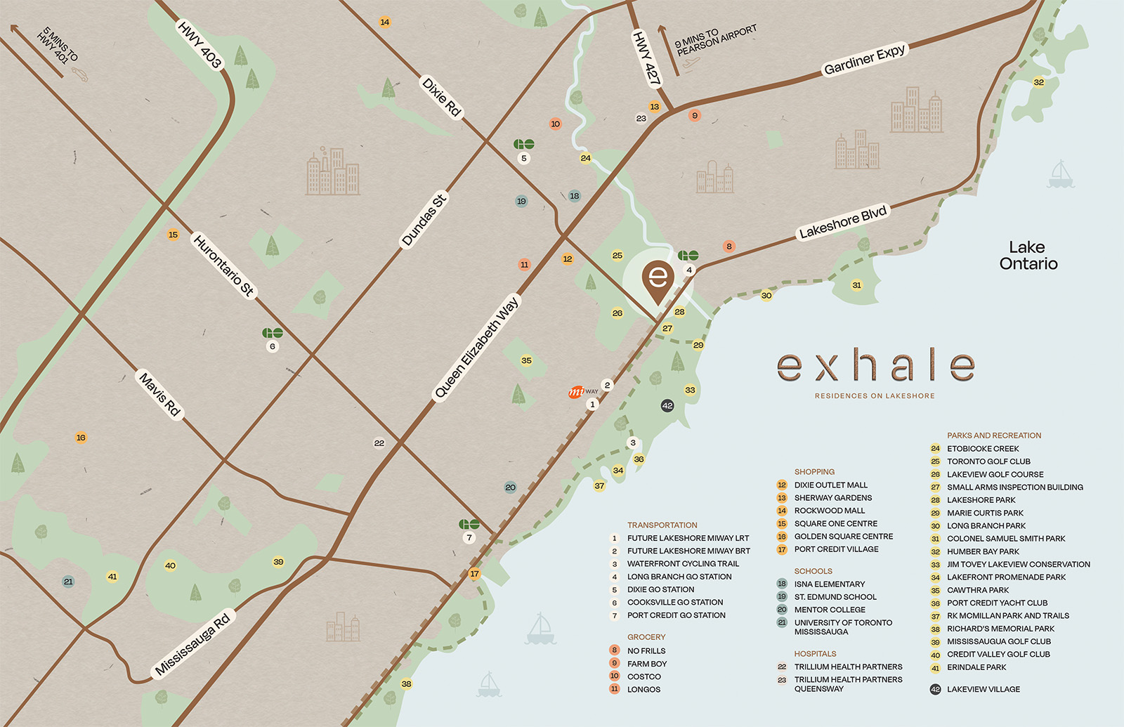 Directly across the street from Lakeshore Park and just a few minutes walk to Marie Curtis Park, you’ll discover the perfect escape from the stresses of your daily life. Walk the dog, run the trail, stroll the water’s edge. And it’s all just moments from your door at Exhale Condominiums on Lakeshore.